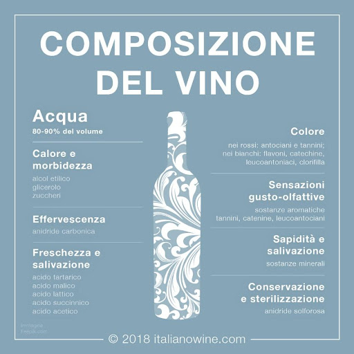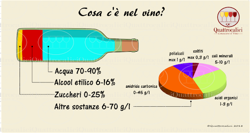Noi, annusando o assaggiando un vino, avvertiamo immediatamente determinati sentori che sembra siano la componente principale del vino. In realtà i due componenti primari del vino sono acqua, tra il 70 e il 90%, e alcol etilico, tra il 6 e il 16%. Esiste un terzo componente ed è costituito da quella parte di zuccheri rimasti in sospensione e non fermentati, principalmente glucosio e fruttosio, andando ad occupare tra lo 0 e il 25% di volume.